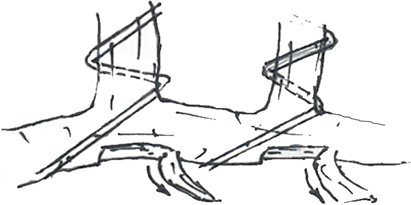 Probably a better method of wiring is to place a heavy wire along the top side of the laid down trunk, attach it with string in a few places and then anchor the wires for each branch individually onto it. Another alternative would be to wire each branch individually with double wire looped once around the prostrate trunk. This too however, can interfere with root formation.