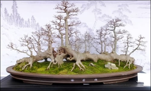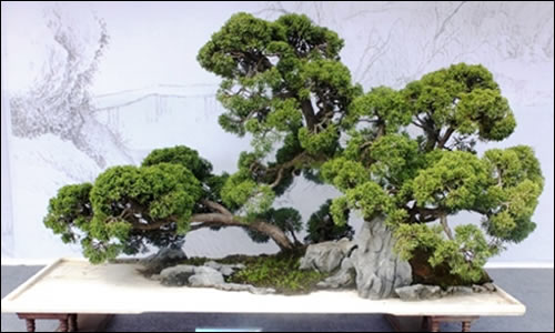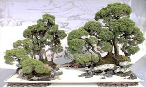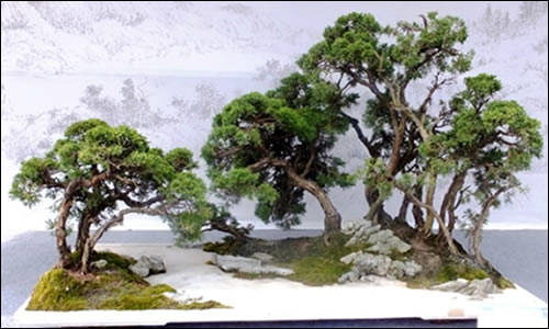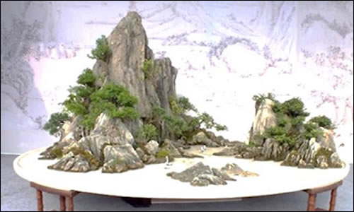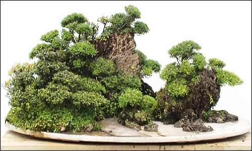 It is a development of the Japanese arts of bonsai, bonseki (tray lanscape using white sand and rocks) and bonkai, (three dimensional papier-mâche created landscape) and is related to the miniature-landscape arts of Chinese penjing. It is the art of creating tray landscapes that combine miniature living trees with soil, rocks, water, and related vegetation in a single tray or similar container. A saikei landscape will remind the viewer of a natural location through its, choice of ground materials, and the species used in its plantings.