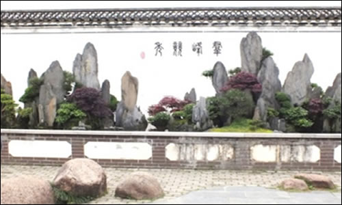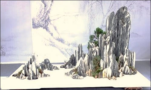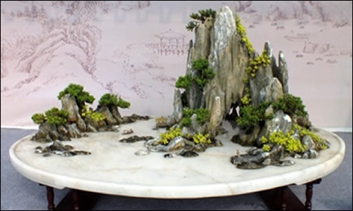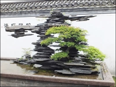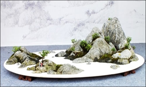 The rocks or stones used in saikei do not need to be specimen suiseki, they are just rocks of similar character to the scene you are creating; they should however, if the scene is to be realistic, be geologically similar. Sedimentary rocks (those laid down under the sea) should not appear in the same landscape as igneous or volcanic rocks. It is quite acceptable and frequently done in China, to create rocks by cementing (gluing) similar pieces of rock, (often slate) together to give the appearance of a very craggy rock.