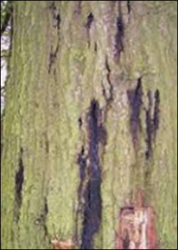 - Longitudinal splits or fissures in the bark at the site of the bleeds