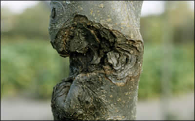 Round or oval areas of dead, sunken bark cankers are perennial, with the affected area covered with dead bark that shows concentric rings indicating periods of active spread. Older cankers lose the bark, exposing dead wood in the centre. Perennial cankers develop raised edges as the tree’s bark attempts to grow back over the exposed area. Eventually the branch will die above the canker, being progressively weakened as the bark is killed.