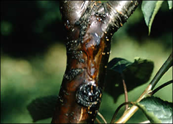 Bacterial canker is a disease of the stems and leaves of Prunus, especially plums and cherries, but also apricots, peaches and ornamental Prunus species. It causes sunken patches of dead bark and small holes in leaves, called ‘shotholes’