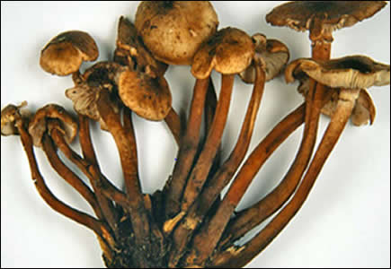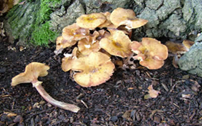 Honey fungus is the common name given to several different species of the fungus Armillaria that attack and kill the roots of many woody and perennial plants. The most characteristic symptom of honey fungus is white fungal growth between the bark and wood, usually at ground level. Clumps of honey coloured toadstools sometimes appear briefly on infected stumps in autumn.