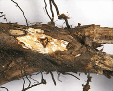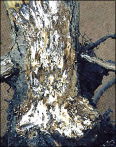 To check whether a plant is infected, peel away the bark at the base and look for a white or creamy layer of fungal tissue.