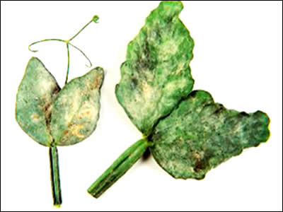 White, powdery spreading patches of fungus on upper or lower leaf surfaces, flowers and fruit.
