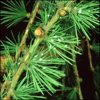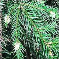 A native of USA which has become widely established in the UK. It alternates between spruce (Picea) and Douglas fir. Infestations cause most damage on Douglas fir where foliage can become encrusted in white fluffy wax, sooty moulds and becomes mottled. On spruce infestations, cause galls which can affect the growth of new shoots. The adelgid lays eggs in the spring on Douglas fir. The nymphs soon hatch and feed on the needles producing large amounts of white wax and honeydew. The adult females are less than 2mm in length and reddish brown to black; both winged and wingless forms occur. In early summer the winged forms migrate to spruce where they produce a generation that overwinters. In spring the overwintered generation induces elongate galls on spruce. This generation matures in the summer producing winged females that migrate to Douglas fir and overwinter, laying eggs in the spring.