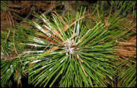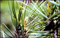 This species covers itself in a white waxy material on larch and can cause the foliage to become discoloured and distorted causing a premature loss of needles. On spruce it forms pineapple galls that are up to 15mm long. The blackish nymphs of this adelgid overwinter on young larch shoots, maturing in early spring and laying eggs at the base of leaves. Nymphs from these eggs develop into wingless or winged 1.5 mm long dark green adults. The winged individuals migrate to spruce. Wingless individuals continue to breed on larch and extensive populations can develop, characterised by large quantities of white waxen wool and honeydew. Those that migrate to spruce produce a wingless generation that produces gall forming individuals in the following spring. Winged individuals mature in these galls in summer and migrate to larches where they lay eggs.