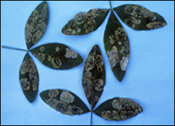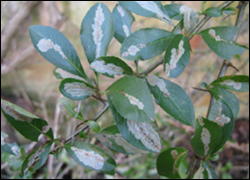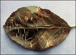 There are a some 700 species of leaf miners affecting specific species; they are the small larvae from a fly that burrow into leaves doing considerable damage on the way, the insect is usually detectable at the end of its burrow. Frequently seen types are: pyracantha leaf-mining moth, laburnum leaf-mining moth, leaving brown and grey blotches in its wake. Apple leaf mining moth produces whitish or brown lines in the leaves.
