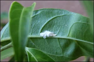 - Mealybug is usually first noticed as a fluffy white wax produced in the leaf axils or other sheltered places on the plant. The insects or their orange-pink eggs can be found underneath this substance