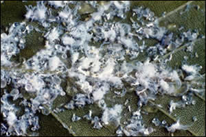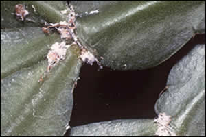 Mealybugs are common insects that tend to live together in clusters in inaccessible parts of plants, such as leaf axils, leaf sheaths, between twining stems and under loose bark. There are also mealybug species found on plant roots. Mealybugs suck sap from plants and then excrete the excess sugars as a substance called honeydew. This lands on the leaves and stems where it is often colonised by sooty moulds, giving the surfaces a blackened appearance.