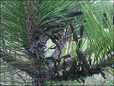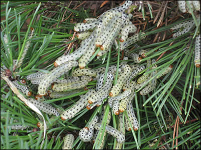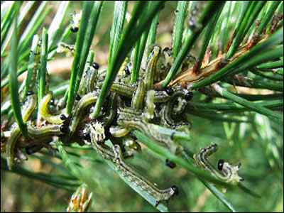 The caterpillar-like larvae of two species of sawfly (pine sawfly and fox-coloured sawfly) they can on occasion cause serious defoliation of pine trees. They are at their most active in spring and summer. Pine sawfly is considered a pest as it eats a lot of needles; this can stunt the growth of the tree, it rarely is enough to kill the tree.
