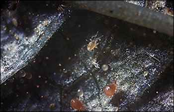 - On leaves: Plants with glasshouse red spider mite show a fine pale mottling on the upper leaf surface. The underside of the leaves have many tiny yellowish green mites and white cast skins and egg shells. These are more easily seen with the aid of a x10 hand lens