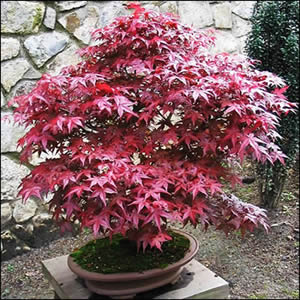 Acer palmatum is a deciduous shrub or small tree reaching heights of 6 to 1 m., often growing as an under plant in shady woodlands. It may have multiple trunks joining close to the ground. In habit, its canopy often takes on a dome-like form, especially when mature. The leaves are long and wide, palmate, lobed with five, seven, or nine acutely pointed lobes.