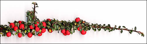 C. horizontalis is a spreading dwarf deciduous shrub to 2m in width, with distinctive, flat, regularly-branched sprays of foliage with small glossy leaves that turn orange and red in autumn. Pink-tinged flowers and red berries.