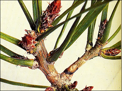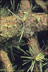 Foliage takes the form of needles. Pines have four stages of needle growth:-