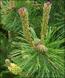 The main features that distinguish the mountain pine from the more familiar Scots pine (Pinus sylvestris) are the resinous buds and the shiny-green to purplish bark on young wood. Pinus mugo produce paired needles, 2 - 5cm long that are dark-green and slightly twisted. Cones start as violet-coloured flowers that grow in large numbers along new shoots.