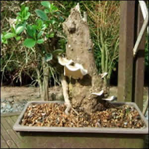 - Deadwood frequently a feature of this species needs special care. It has a very soft core wood that rots very rapidly and is almost impossible to prevent. Therefore any carving must be treated as soon as it has dried out thoroughly right down to root level; with either a wood hardener such as that sold by Ronseal or alternatively with a cyanoacrylate form of liquid super glue. Use superglue liquid, not gel. Apply when the wood is as dry as possible. If necessary, first use a small gas blowtorch to drive out any moisture that remains in the outer layers. When the superglue is dripped on the deadwood, it soaks straight in. Keep dripping the superglue into the wood until it becomes glossy showing that the wood is fully saturated The superglue takes a few hours to harden. You can then wire-brush to remove the glossy finish. Apply some protection to the roots when applying any run off of surplus glue into the soil although it does little harm.