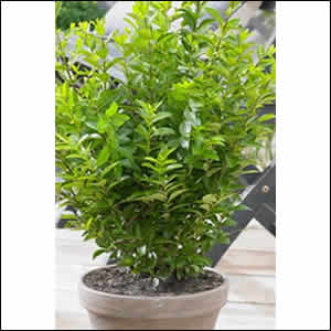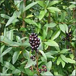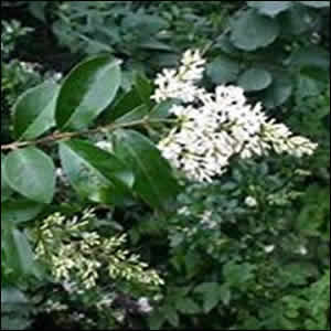 A deciduous or semi-evergreen shrub with narrowly oval, dark-green leaves to 6 cm long. White flowers are produced in panicles to 5 cm long in early and mid-Summer followed by spherical black fruit. Native to Europe, North Africa and Asia, the Common Privet is less vigorous than the Oval Leaf Privet but can still reach heights of 3m.